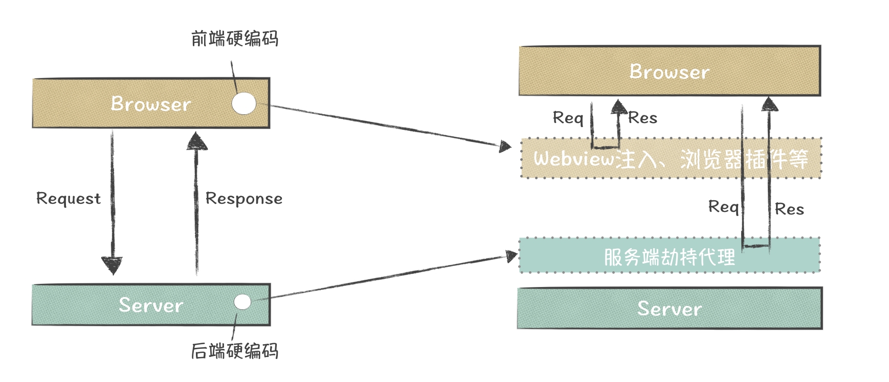 前端拦截即在请求真正发送前做的拦截返回,这种切面通常可以通过 「Webview 容器定制」 和 「浏览器插件」 两种方式来实现。
